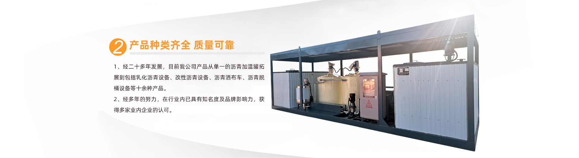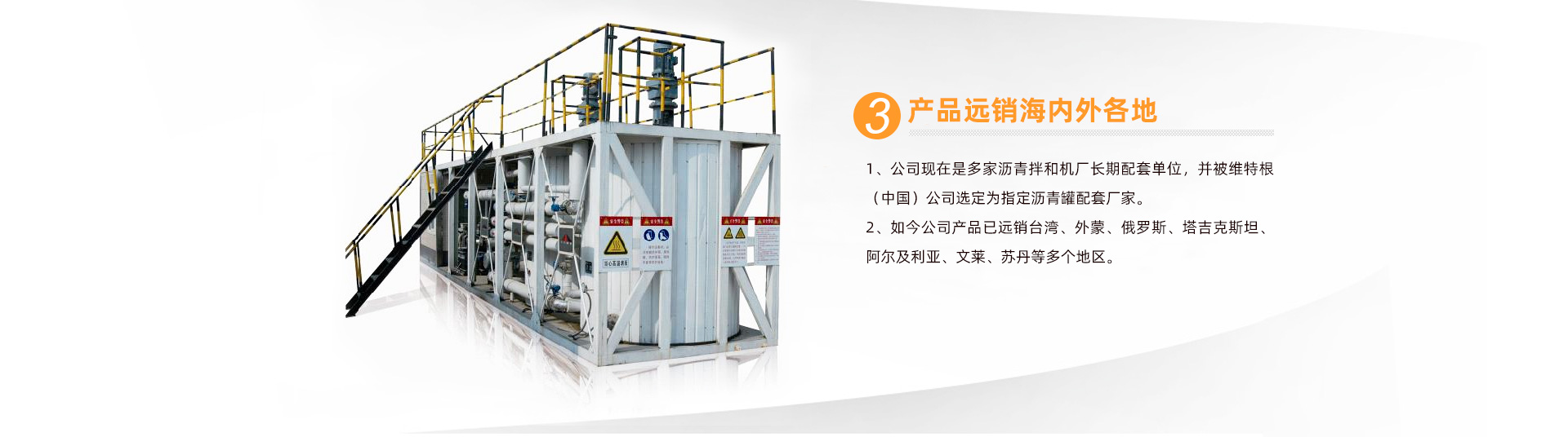 經(jīng)多年的努力,在行業(yè)內(nèi)已具有知名度及品牌影響力,獲得多家業(yè)內(nèi)企業(yè)的認(rèn)可,公司現(xiàn)在是多家瀝青拌和機(jī)廠長期配套單位,并被維特根(中國)公司選定為指定瀝青罐配套廠家。如今公司產(chǎn)品已遠(yuǎn)銷臺灣、外蒙、俄羅斯、塔吉克斯坦、阿爾及利亞、文萊、蘇丹等多個地區(qū)。 ...... 【查看詳情】
